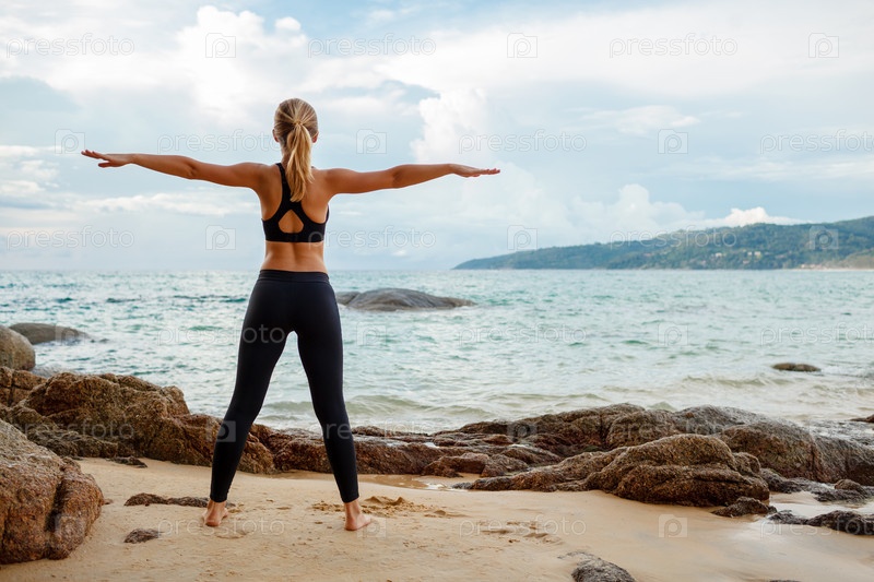 Женщина занимается йогой на пляже