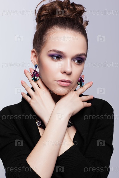 Темноволосая молодая женщина с бижутерией на сером фоне