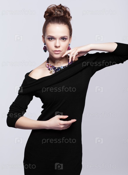 Темноволосая молодая женщина с бижутерией на сером фоне