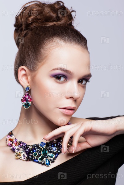 Темноволосая молодая женщина с бижутерией на сером фоне