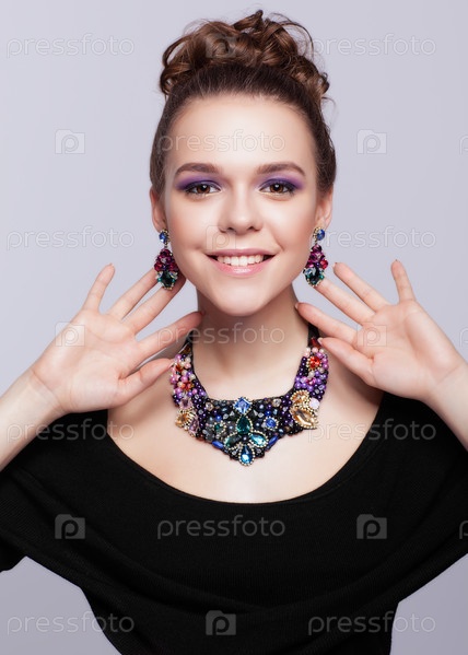 Темноволосая молодая женщина с бижутерией на сером фоне
