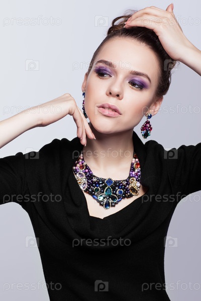 Темноволосая молодая женщина с бижутерией на сером фоне