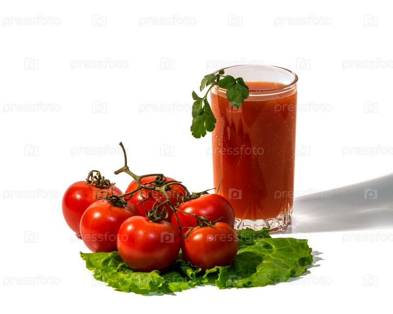 Томаты и томатный сок, изолированные на белом фоне