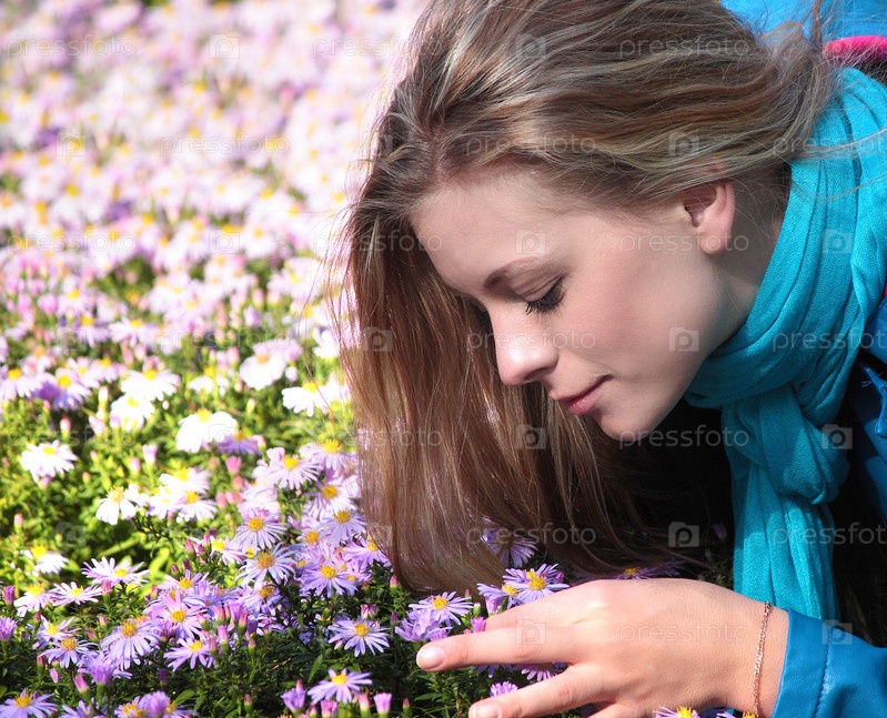 Девушка нюхает цветы