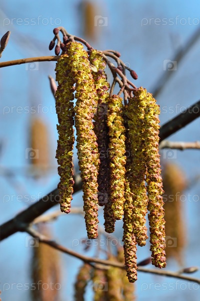 Весна. Сережки ольхи крупным планом