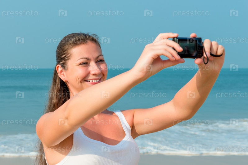Девушка фотографирует себя на фоне моря