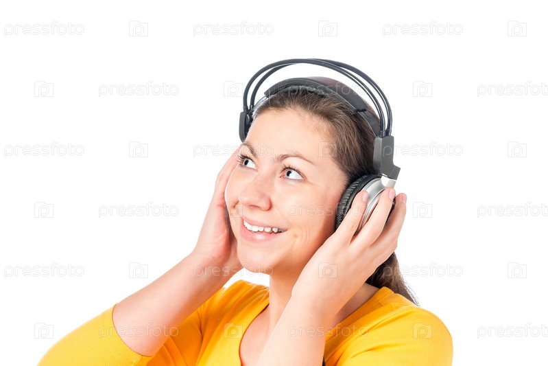 Портрет девушки в наушниках на белом фоне