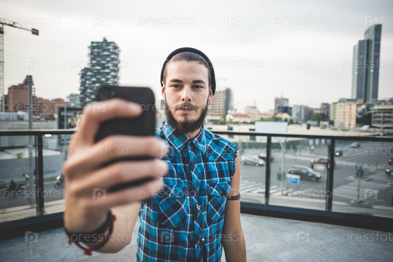 Молодой бородатый хипстер делает селфи