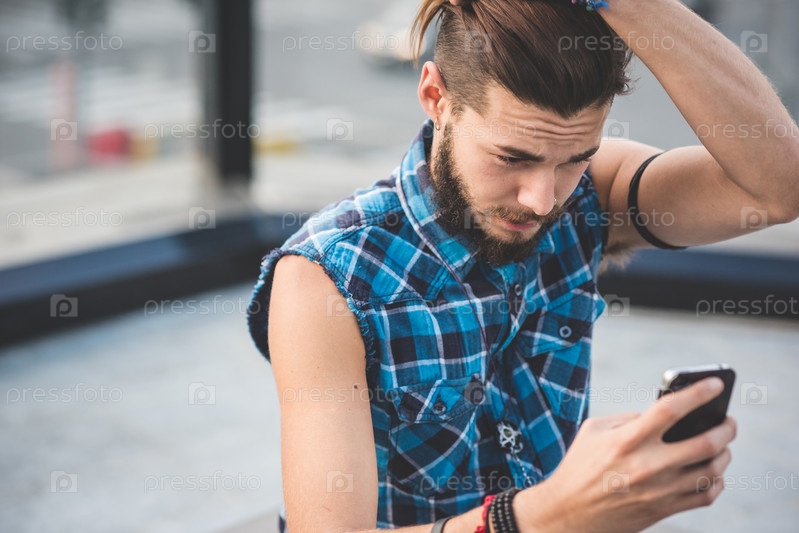 Молодой бородатый хипстер делает селфи