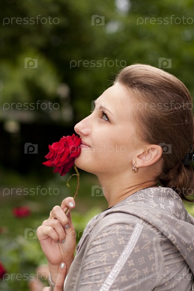 Портрет молодой девушки с красной розой в руках