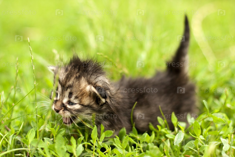 Маленький котенок на фоне зеленой травы