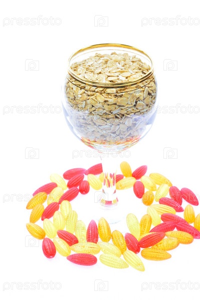 Овсяная каша и разноцветный мармелад на белом фоне