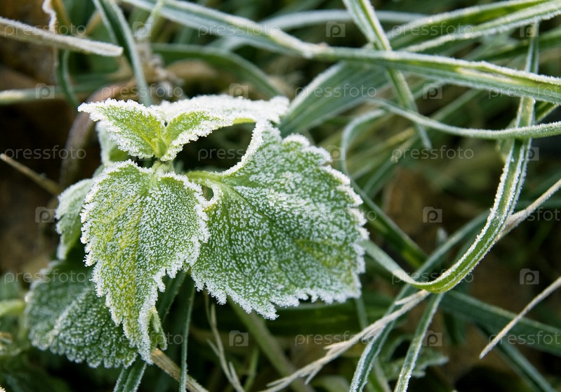 Зеленые растения, покрытые инеем