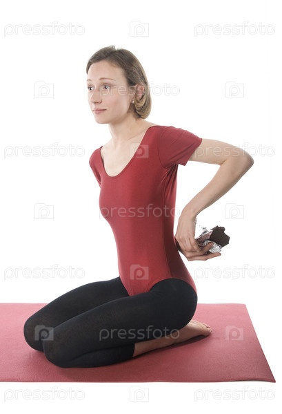 Женщина делает упражнения и тайно ест шоколад