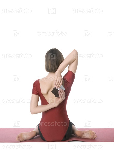 Женщина делает упражнения и тайно ест шоколад