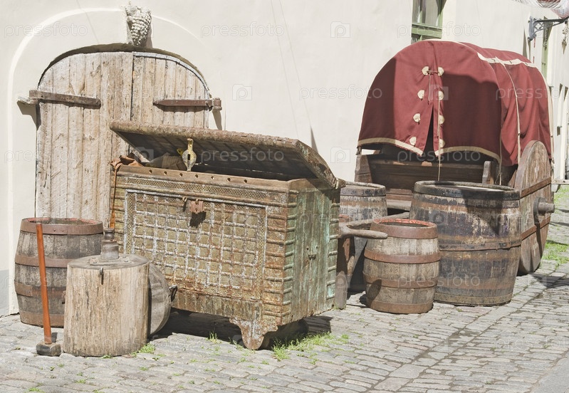 Старинные бочки, сундук и повозка