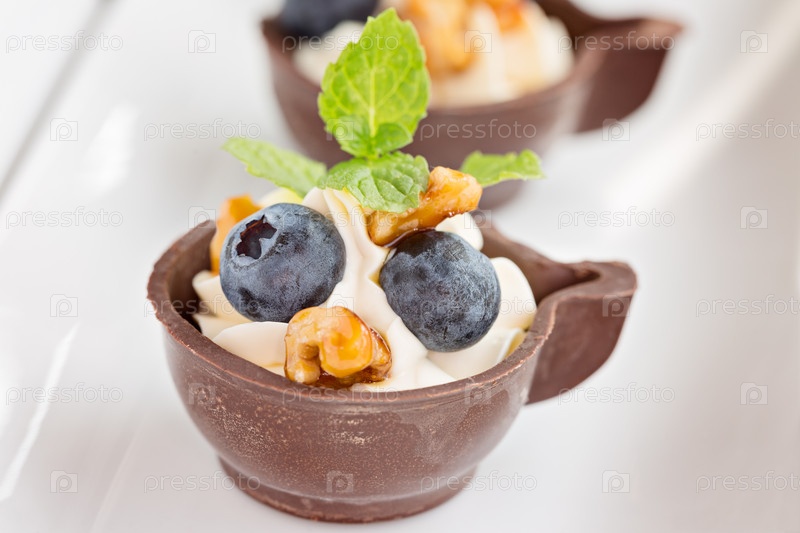 Десерт маскарпоне с карамелизированными орехами, черникой и мятой в шоколадной чашке