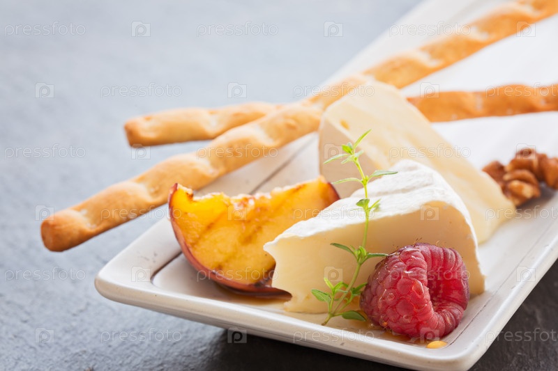 Сыр камамбер с персиком, свежая малина и тимьян крупным планом