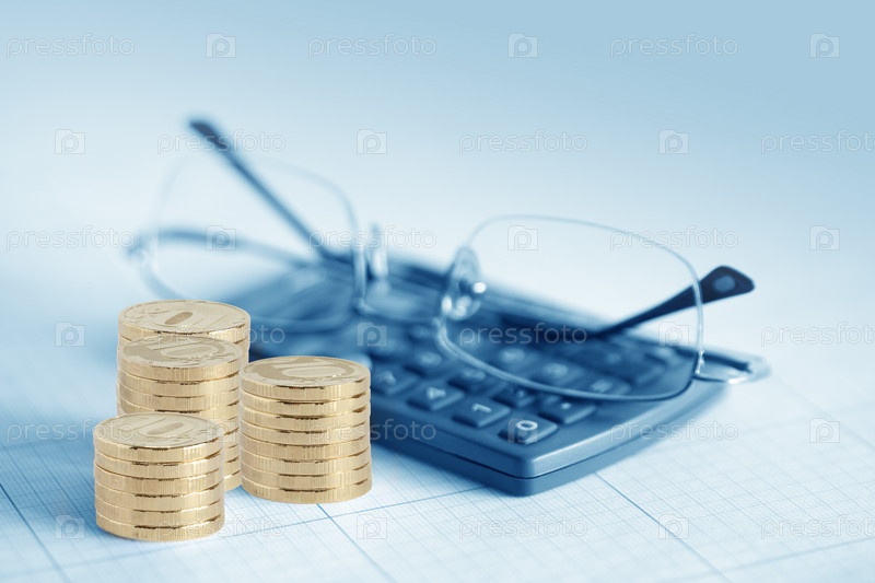 Стопки рублевых монет, калькулятор и очки крупным планом