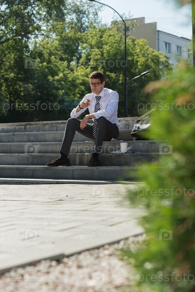 Бизнесмен сидит на лестнице