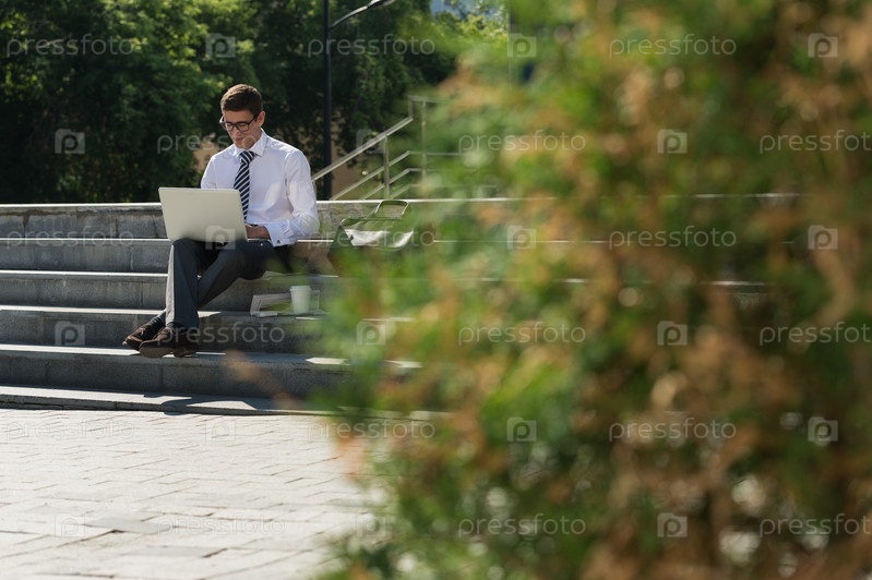Бизнесмен с ноутбуком на улице