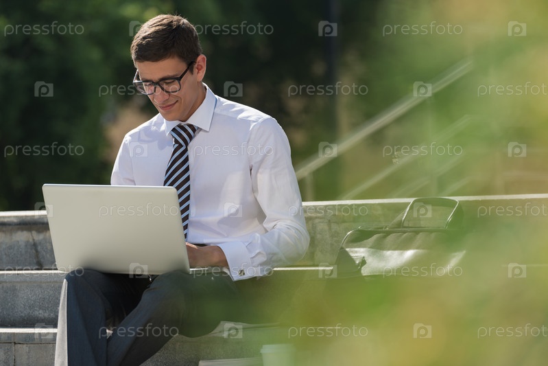Бизнесмен с ноутбуком на улице
