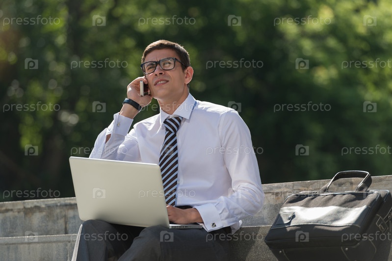 Мужчина с ноутбуком говорит по телефону