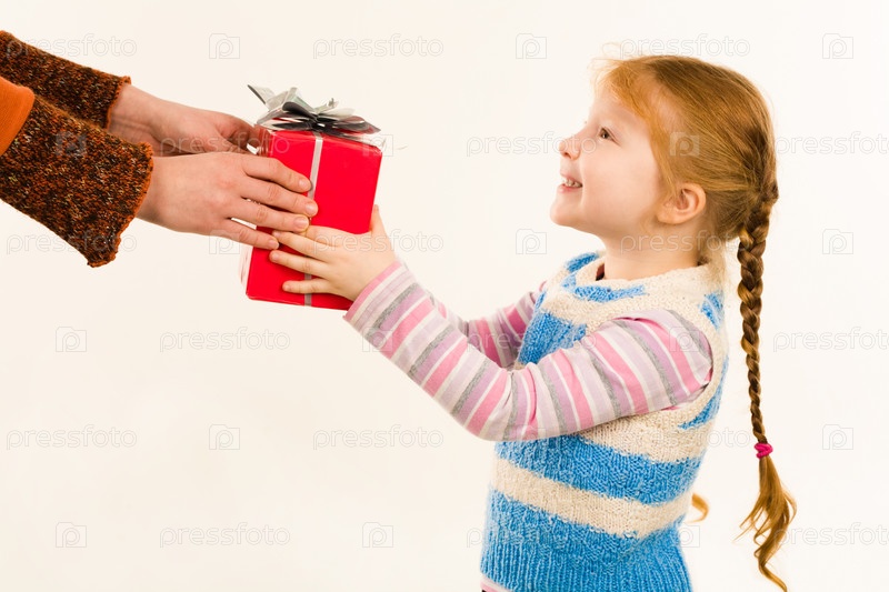 Маленькая девочка получает рождественский подарок от женских рук на белом фоне