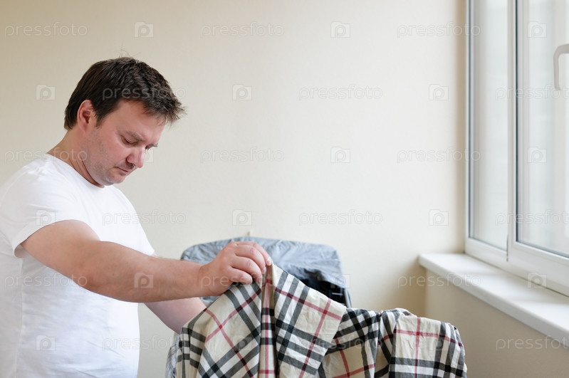 Темноволосый мужчина вешает клетчатый плед сушиться у окна