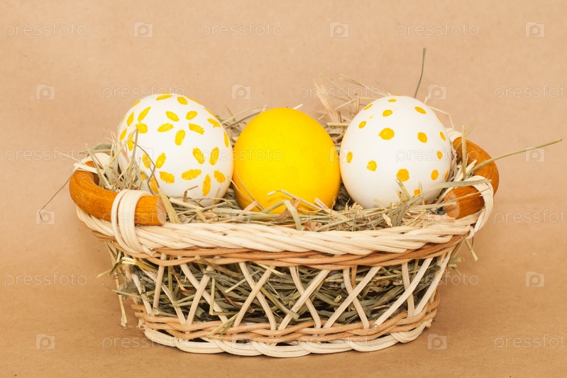 Три пасхальных крашеных яйца в корзине с сеном