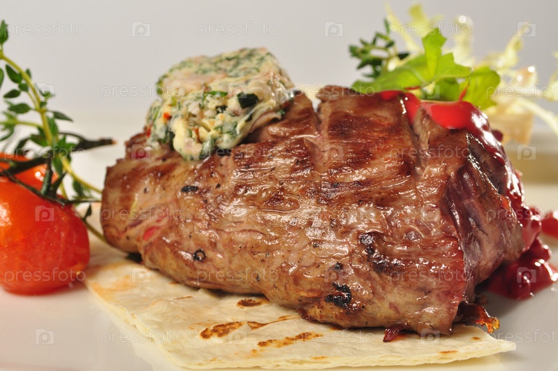 Жареный стейк с соусом и салатом