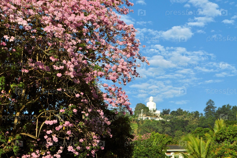 Цветущее вишневое дерево и статуя Будды, Канди, Шри-Ланка