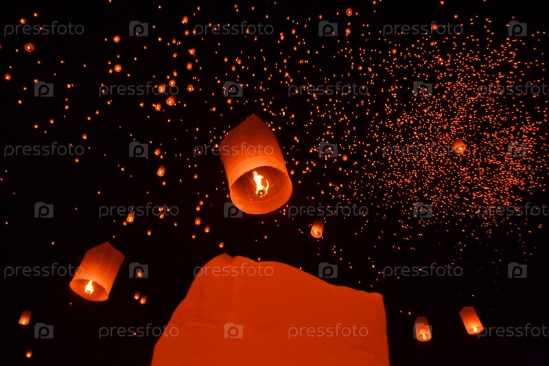 Буддийские фонари в небе на празднике фонарей
