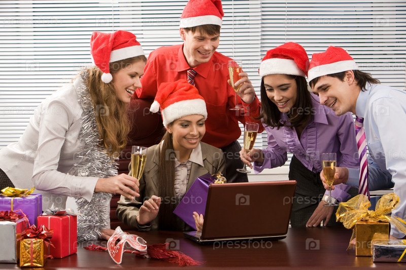Портрет взволнованных коллег, собравшихся вместе в офисе и устраивающих корпоративную вечеринку
