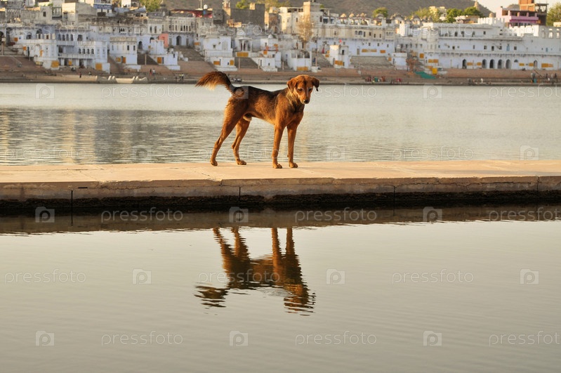 Собака на озере в Священном городе Пушкар, Индия
