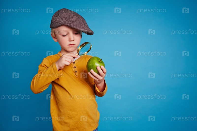 Мальчик изучает яблоко через лупу