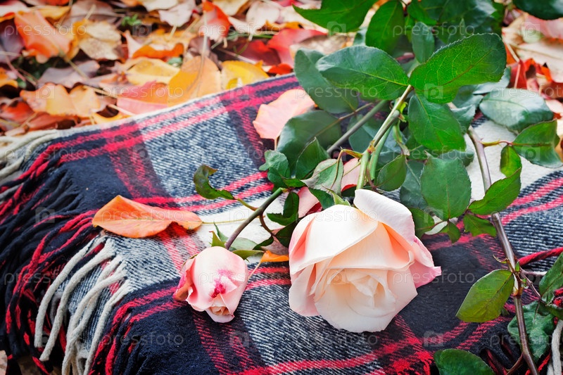Красивые белые розы и плед среди желтых осенних листьев