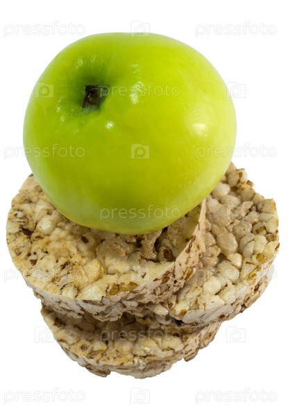 Яблоко и хрустящий хлебец на белом фоне