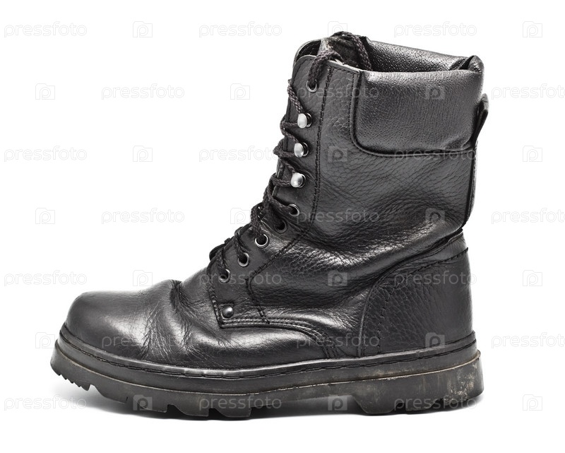 Черный кожаный армейский ботинок на белом