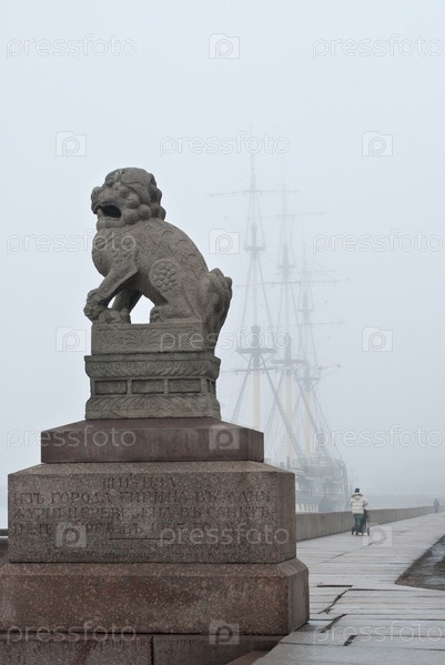 Гранитная скульптура на набережной реки Нева на фоне старого парусного корабля, Санкт-Петербург