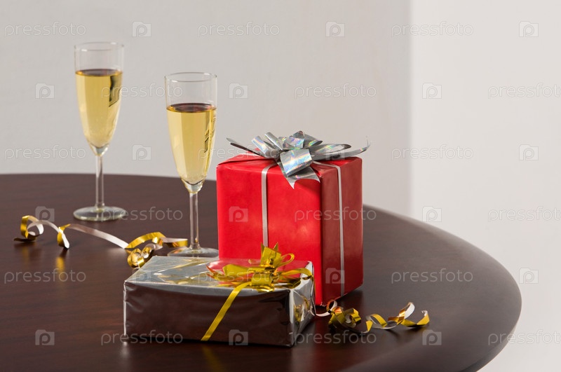Изображение двух подарков и флейты с шампанским на столе