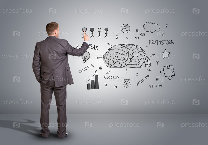 Деловой человек показывает иконки на стене
