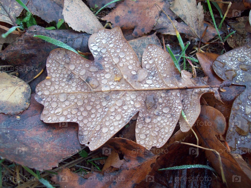 Дубовый листик с капельками росы