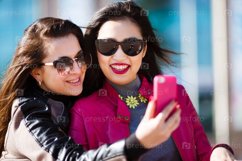 Две счастливые женщины делают селфи