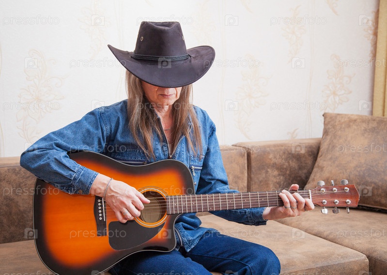 Пожилой мужчина в шляпе играет на гитаре