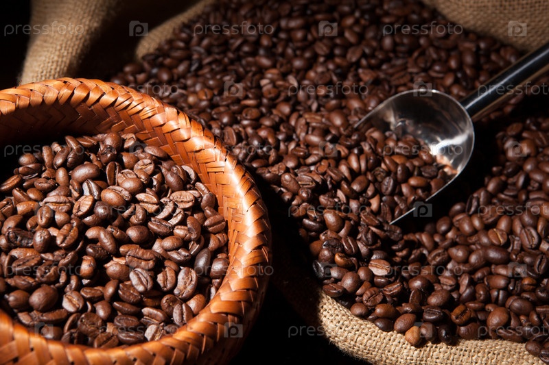 Жареные кофейные зерна в бамбуковой корзинке