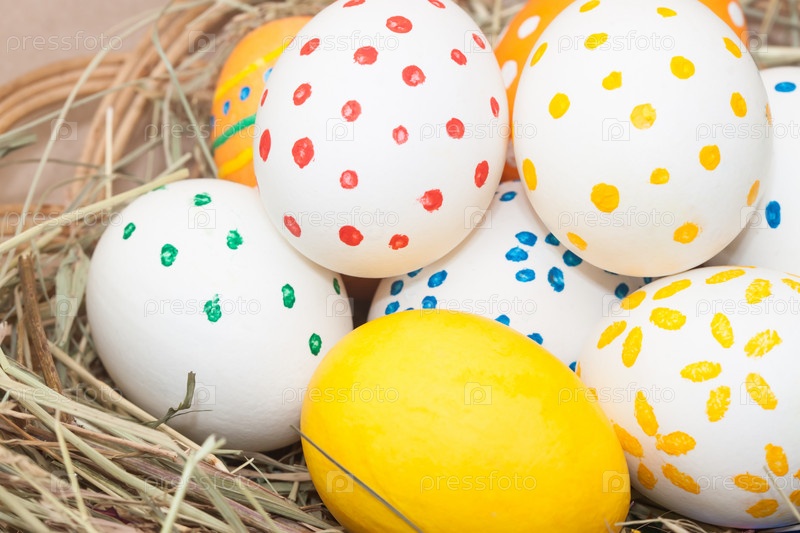 Цветные пасхальные яйца в корзине