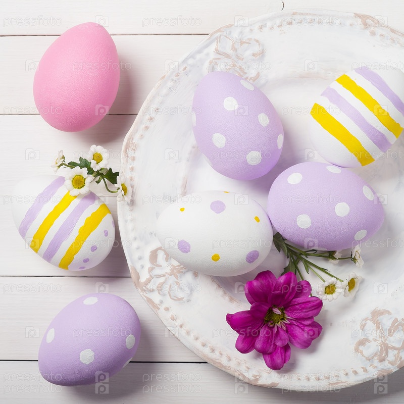 Крашеные пасхальные яйца и цветы на тарелке