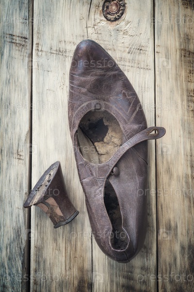 Старые изношенные туфли на деревянном столе. Вид сверху