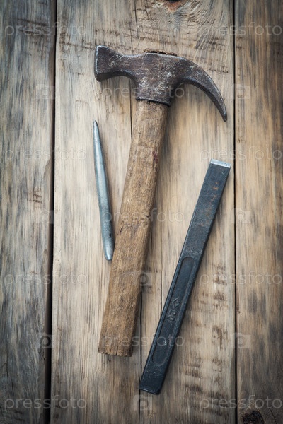 Старые строительные инструменты на деревянном столе. Вид сверху